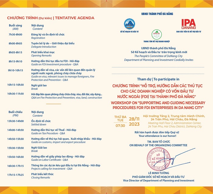 Workshop on "Supporting and Guiding necessary procedures for FDI enterprises in Da Nang City Author: Anh Quỳnh Lê Updated: 17/11/2023 Views: 8 1. Time: November 28, 20232. Venue: Hall 3, floor 2, Da Nang Administration center 3. Atentive agenda Register at link.