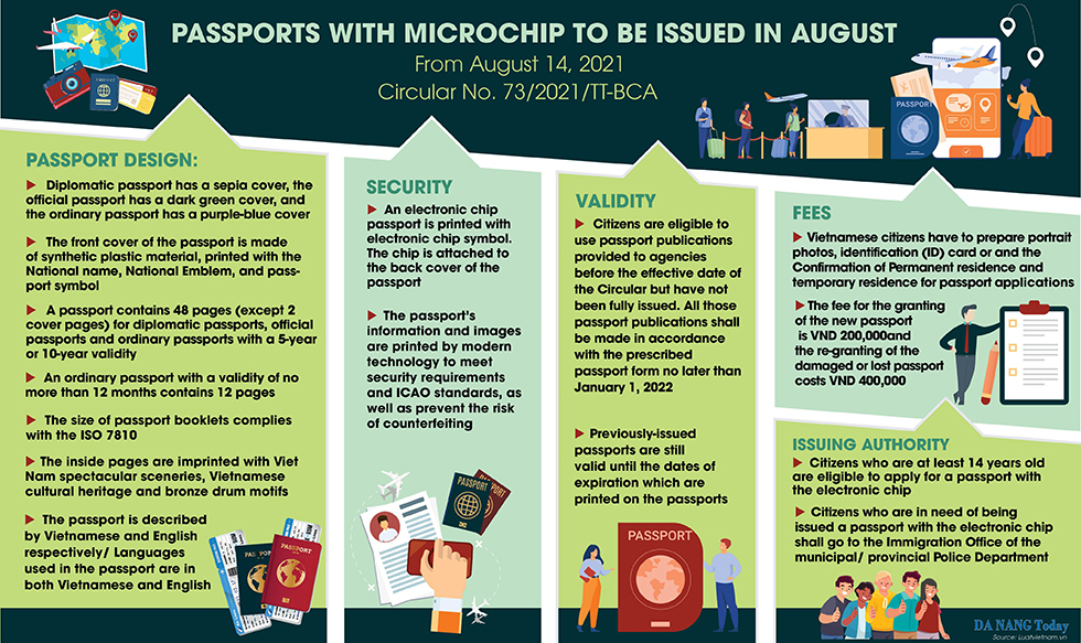 Circular 73/2021/TT-BCA of the Ministry of Public Security stipulates passport specimens, border pass documents and related forms shall take effect since August 14, 2021. Citizens who are of legal age are eligible to apply for an ordinary passport with electronic chip.