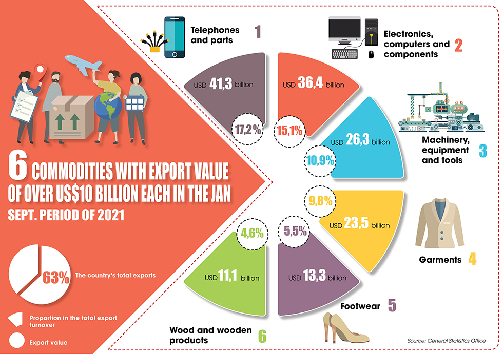 In the first 3 quarters of 2021, 6 commodities record export values of more than US$ 10 billion each, accounting for 63% of country’s total export turnover.