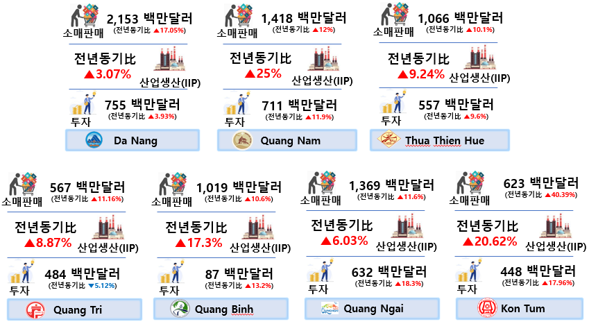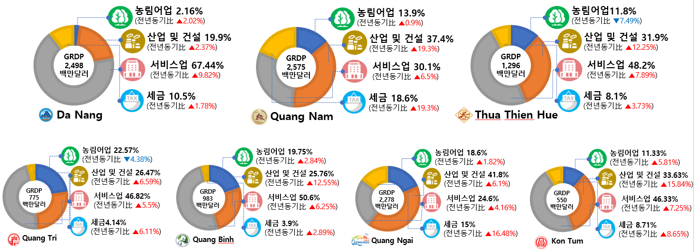 2021년 중부지역의 평균 GDP 성장률이 4.76%이었던 점을 감안하면 7.63%를 기록한 2022년 상반기 중부지역의 경제 회복 속도는 굉장히 가파르다고 볼 수 있다. 성시별로 살펴보면, 꽝남성이 12.8%로 베트남 63개 성시 중에서 4번째로 높은 상반기 경제성장률을 기록하며 중부지역 경제 성장을 이끌었다. 중부지역 대표 도시인 다낭시의 경우 주력산업인 관광 및 서비스업이 활기를 되찾으면서 GRDP 성장률이 2021년의 0.18%에서 2022년 상반기에는 7.23%로 상승하며 중부지역에서 가장 큰 회복세를 시현했다.