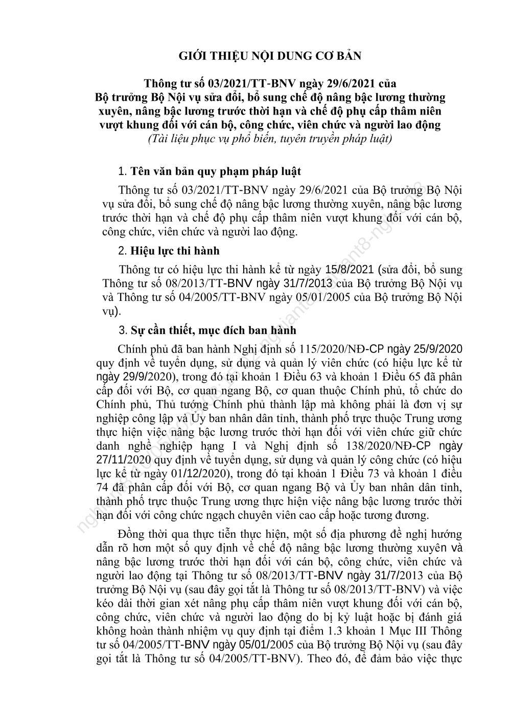Nội dung cơ bản Thông tư số 03 của BT Bộ Nội vụ sửa đổi, bổ sung chế độ nâng bậc lương thường xuyên, nâng bậc lương trước thời hạn và chế độ phụ cấp...pdf