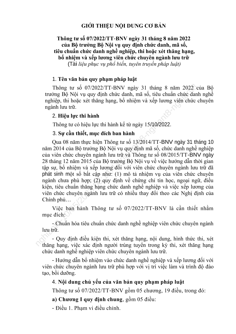 Nội dung cơ bản Thông tư số 07 ngày 31.8.2022 của BT Bộ Nội vụ qđ chức danh, MS, TCCD nghề nghiệp..... viên chức chuyên ngành lưu trữ.pdf