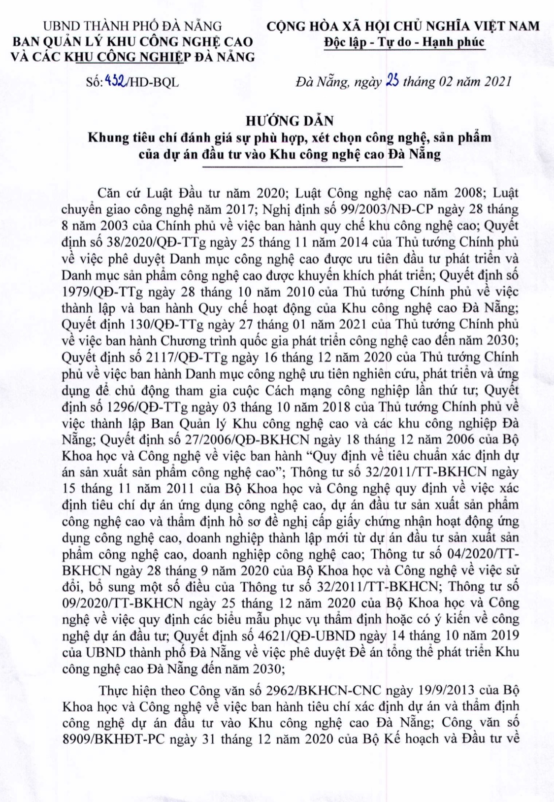 Với mục đích nâng cao hiệu quả công tác đánh giá sự phù hợp của dự án đầu tư, xét chọn công nghệ, sản phẩm của dự án đầu tư và hỗ trợ nhà đầu tư tham khảo xây dựng hồ sơ dự án đầu tư vào Khu Công nghệ cao Đà Nẵng, Ban quản lý Khu công nghệ cao và các khu công nghiệp đã ban hành Khung tiêu chí đánh giá sự phù hợp, xét chọn công nghệ, sản phẩm của dự án đầu tư vào Khu Công nghệ cao Đà Nẵng.