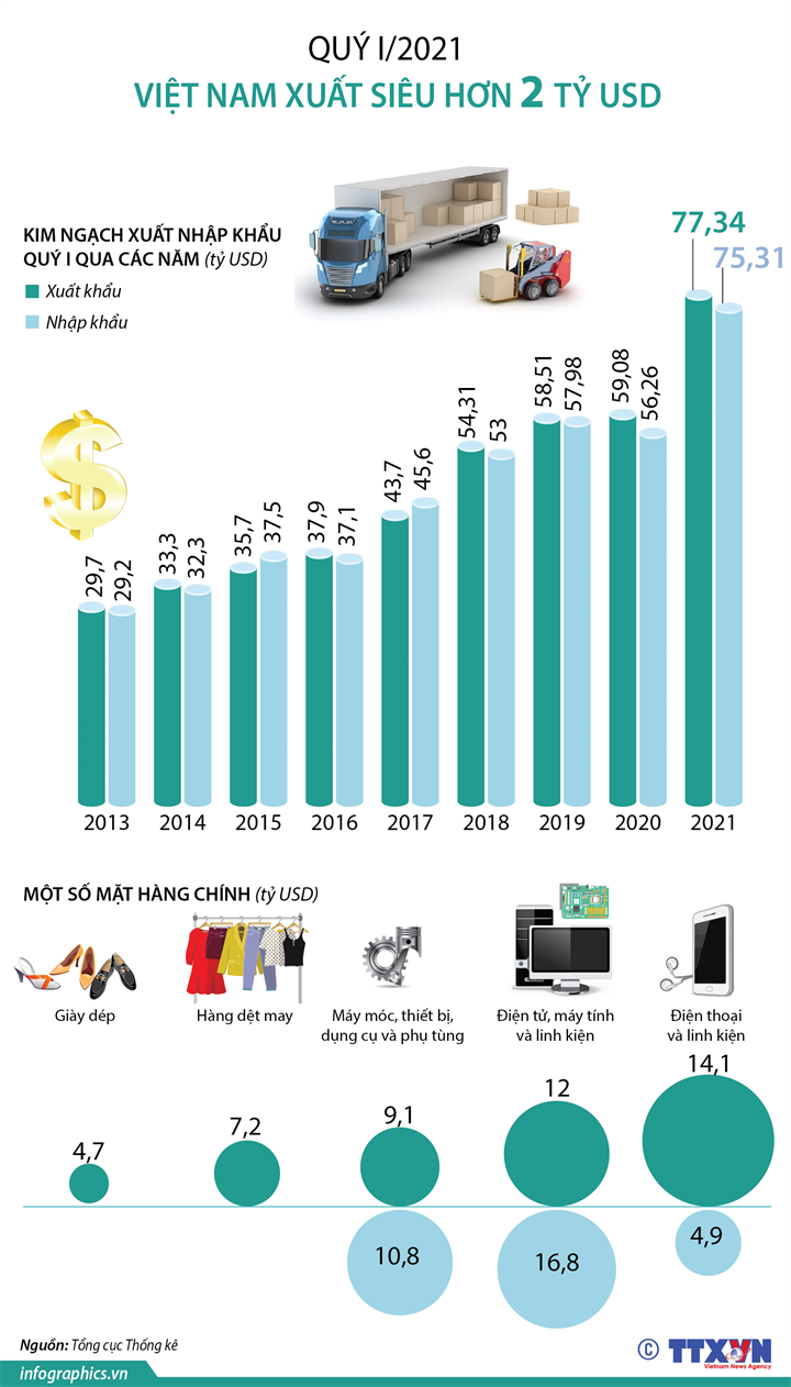 Quý I/2021, Việt Nam xuất siêu hơn 2 tỷ USD Người đăng tin: Admin Admin Ngày đăng tin: 07/04/2021 Lượt xem: 3 Vietnamese Male Quý I/2021, tổng kim ngạch xuất nhập khẩu hàng hóa của Việt Nam ước tính đạt 152,65 tỷ USD. Việt Nam xuất siêu 2,03 tỷ USD.