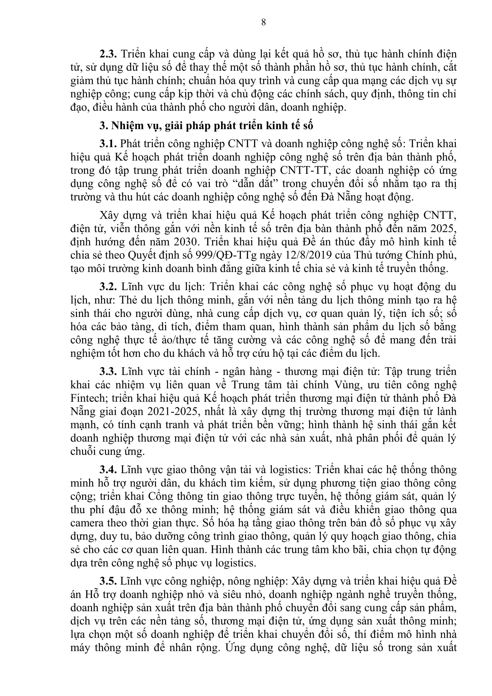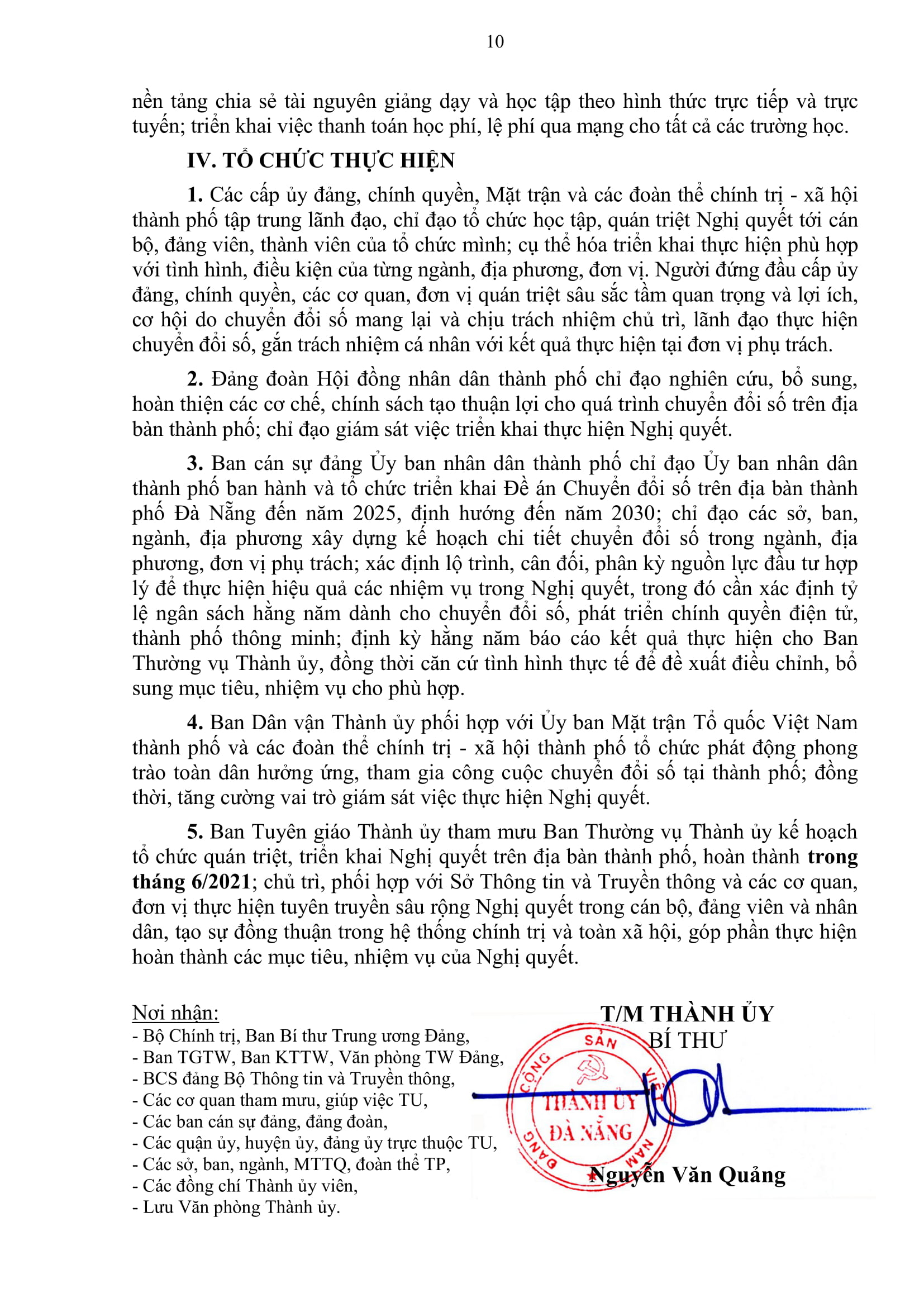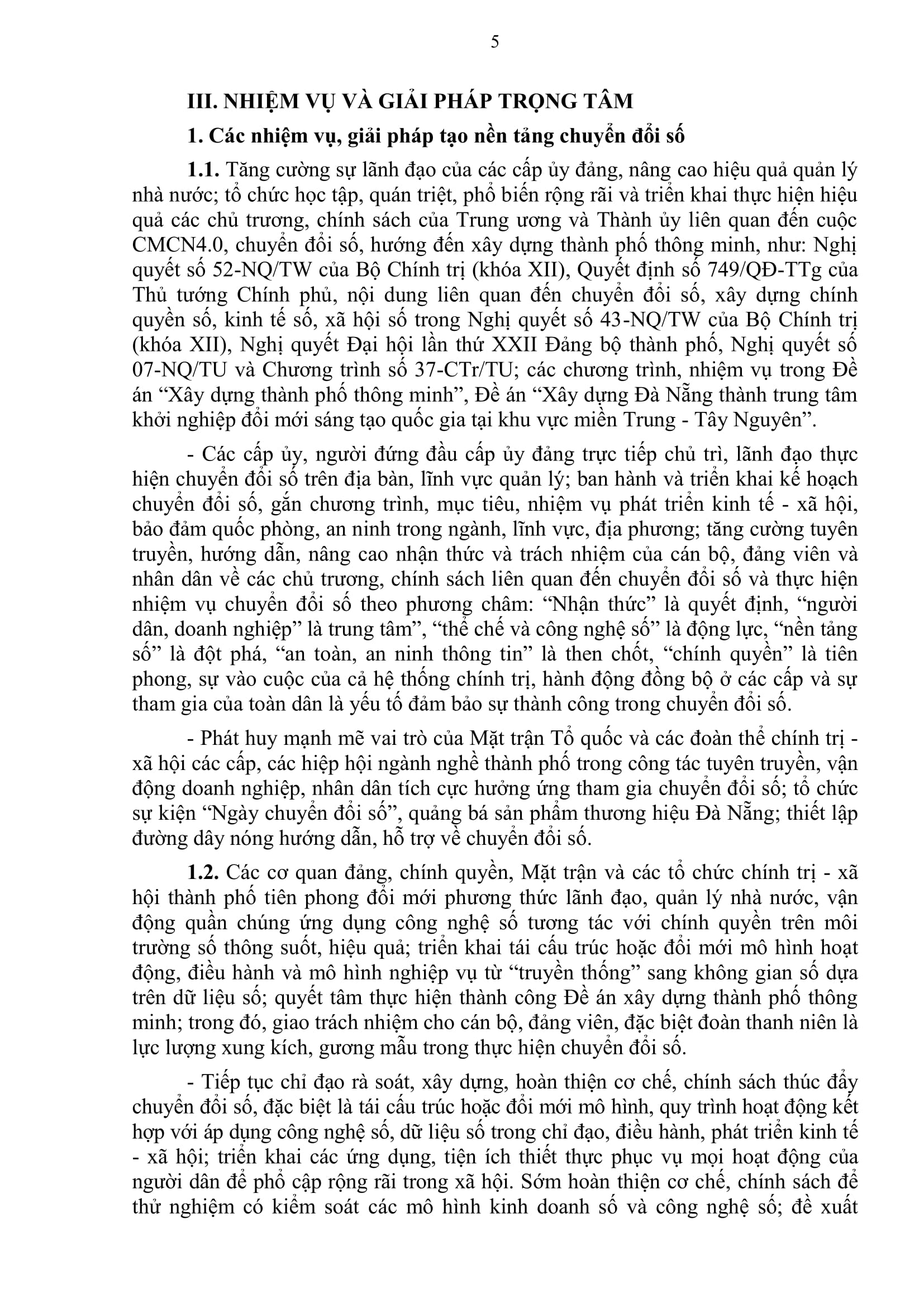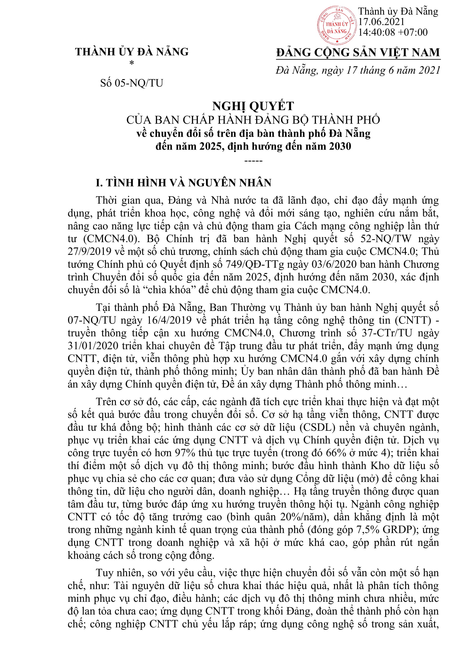 Nhằm tập trung đầu tư phát triển, đẩy mạnh ứng dụng Công nghệ thông tin, điện tử, viễn thông phù hợp xu hướng Cách mạng công nghiệp 4.0 gắn với xây dựng chính quyền điện tử, thành phố thông minh, ngày 17/6/2021, Thành ủy Đà Nẵng ban hành Nghị quyết về Chuyển đổi số trên địa bàn TP Đà Nẵng đến năm 2025, định hướng đến năm 2030.