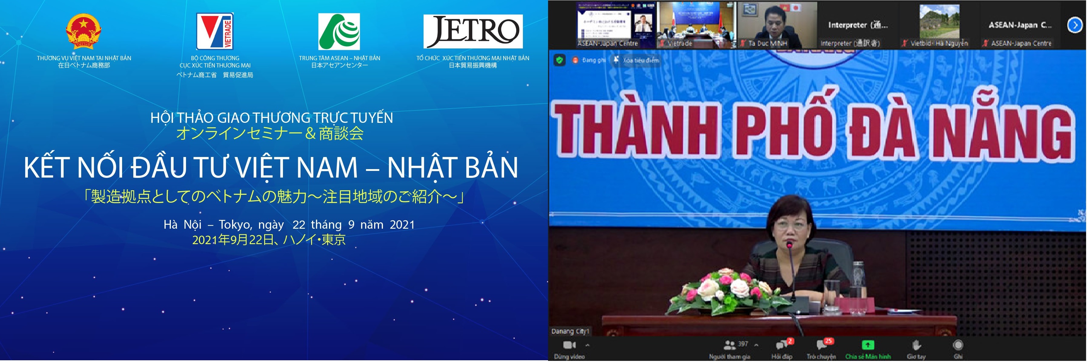 Tham dự Hội thảo có ông Vũ Bá Phú, Cục trưởng Cục Xúc tiến thương mại, ông Kunihiko Hiabayashi, Tổng thư ký Trung tâm ASEAN - Nhật Bản, ông Tạ Đức Minh, Tham tán thương mại Đại sứ quán Việt Nam tại Nhật Bản. Đại diện các địa phương có số lượng doanh nghiệp Nhật Bản đầu tư nhiều nhất cả nước, đầu cầu thành phố Đà Nẵng có bà Huỳnh Liên Phương, Giám đốc Ban Xúc tiến và Hỗ trợ đầu tư Đà Nẵng và phía thành phố Hồ Chí Minh có ông Trần Phú Lữ, Phó Giám đốc Trung tâm xúc tiến Thương mại và Đầu tư thành phố Hồ Chí Minh cùng hơn 400 doanh nghiệp Nhật Bản tham dự trực tuyến.