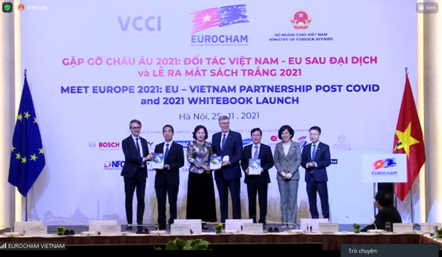 Ngài Giorgio Aliberti, Đại sứ, Trưởng Phái đoàn Liên minh châu Âu tại Việt Nam nhấn mạnh sự thiết yếu của Sách trắng EuroCham vì đây là tài liệu sẽ thể hiện các chỉ số về môi trường kinh doanh, đầu tư tại Việt Nam cũng như chỉ ra những thách thức trước mắt và lâu dài để các bên có cơ sở đề xuất phương hướng, biện pháp giải quyết. Tài liệu này còn thể hiện cam kết của EuroCham đối với Việt Nam trong hợp tác kinh tế. Trong thời gian tới, dù cho tình hình COVID-19 vẫn còn diễn biến trên thế giới, tuy nhiên với sự thực hiện có hiệu quả Hiệp định EVFTA, các bên có thể giải quyết những tác động tiêu cực và bất ổn của đại dịch gây ra cho nền kinh tế. Ông cũng chia sẻ rằng hơn 60% lãnh đạo các doanh nghiệp châu Âu tại Việt Nam đều coi EVFTA là động lực để phát triển sau đại dịch. Ông cũng đề cập đến thành phố Đà Nẵng là một trong những địa phương bùng nổ thu hút FDI trong thời gian qua, tin rằng các địa phương ở Việt Nam cũng sẽ sẵn sang đón nhận các làn song đầu tư mới sau đại dịch. Cuối cùng, ông bày tỏ việc thúc đẩy các nhà đầu tư vừa và nhỏ đầu tư vào Việt Nam vì họ là những doanh nghiệp chuyển giao công nghệ, tạo ra công ăn việc làm và đóng góp cho những giải pháp phát triển bền vững.