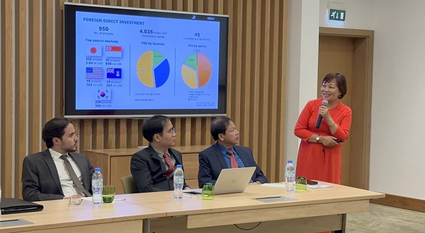 Bà Huỳnh Liên Phương - Giám đốc Ban Xúc tiến và Hỗ trợ đầu tư Đà Nẵng giới thiệu môi trường đầu tư của thành phố (Ảnh: Đoàn công tác)