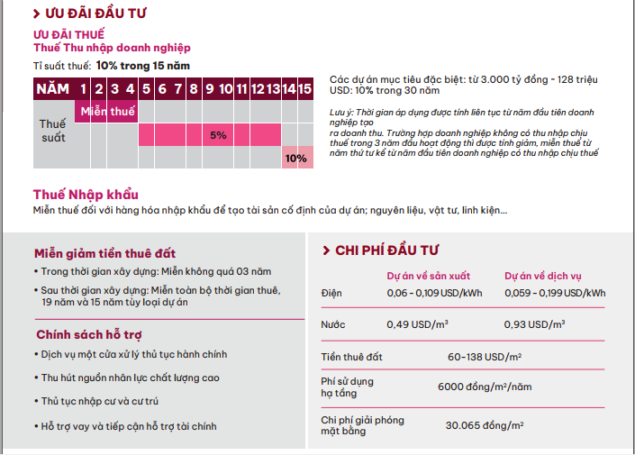 Đối với các dự án trong Khu Sản xuất công nghệ cao, suất đầu tư dự kiến là 15 triệu USD/ha, các dự án Khu nghiên cứu - phát triển, đào tạo và ươm tạo doanh nghiệp và Khu hậu cần, logistic và dịch vụ công nghệ cao lần lượt là 05 triệu USD/ha và 10 triệu USD/ha.