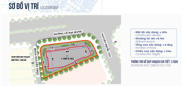 - Khoảng lùi công trình tối thiểu so với ranh giới lô đất: đường Nguyễn Phước Tần, Đoàn Nguyên Thục, Lê Đại Hành lùi: 06m; mặt còn lại: lùi 04m.