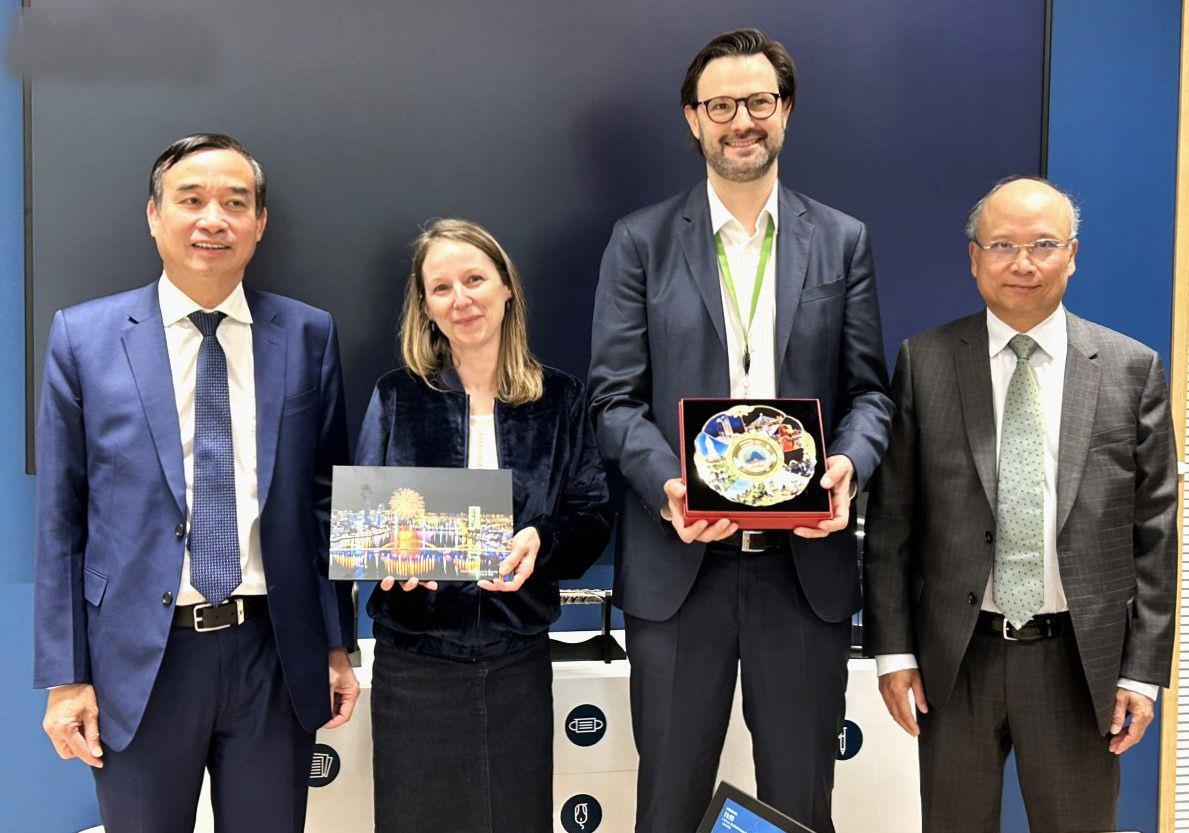 Chủ tịch UBND thành phố Đà Nẵng (ngoài cùng bên trái) tặng quà lưu niệm cho đại diện lãnh đạo Tập đoàn Ubisoft