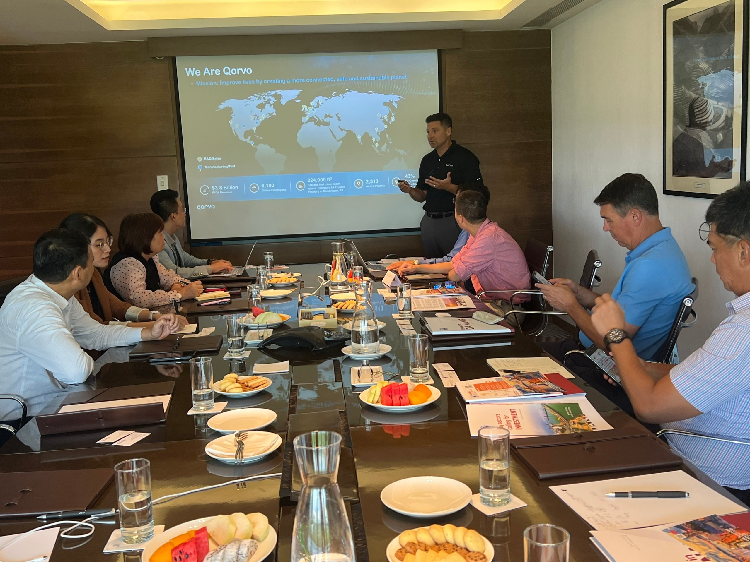 Cũng trong khuôn khổ buổi làm việc, ông Philip Chesley, Phó Chủ tịch Công ty Qorvo Hoa Kỳ, phụ trách mảng tín hiệu tương tự hiệu năng cao và ông Trịnh Khắc Huề, Giám đốc Qorvo Việt Nam đã giới thiệu tổng quan về Công ty Qorvo với những kết quả nghiên cứu phát triển công nghệ mới nhất và kế hoạch mở rộng kinh doanh, đầu tư tại Việt Nam.