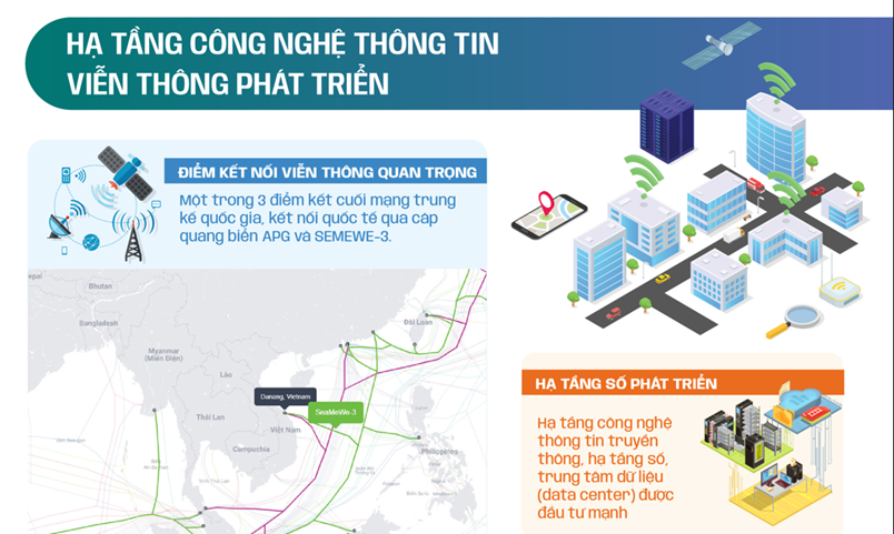 - Đà Nẵng có ưu thế là một trong ba điểm kết cuối quan trọng nhất của mạng trung kế đường trục quốc gia và điểm kết nối trực tiếp quốc tế, trạm cáp quang biển quốc tế APG và SEMEWE 3. Bên cạnh đó, hạ tầng công nghệ thông tin truyền thông, hạ tầng số, trung tâm dữ liệu (data center) được đầu tư song song với sự phát triển nhanh của hệ sinh thái đổi mới sáng tạo, lực lượng lao động công nghệ cao sẵn sàng tiếp cận công nghệ mới đưa Đà Nẵng trở thành một trong những trung tâm (hub) công nghệ thông tin tăng trưởng nhanh của Việt Nam, từ đó hứa hẹn tạo ra sức cạnh tranh cho ngành kinh tế mới của thành phố là ngành vi mạch bán dẫn, trí tuệ nhân tạo.