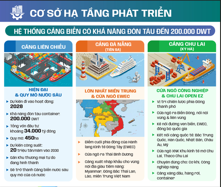 - Đà Nẵng với vị thế cửa ngõ trên tuyến Hành lang Kinh tế Đông - Tây, hệ thống cảng biển Liên Chiểu, Chu Lai, Tiên Sa, đủ điều kiện trở thành trung tâm cảng biển - logistics hàng đầu khu vực ASEAN, là cửa ngõ giao thương quốc tế qua cả đường biển, đường không và đường bộ kết nối đến Lào, Thái Lan, Campuchia, Myanmar.