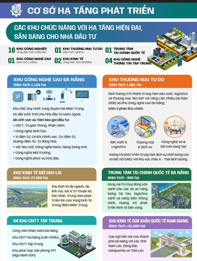 Đà Nẵng có 16 khu công nghiệp (tổng diện tích 3.455,5ha), 01 Khu công nghệ cao (diện tích 1.128ha), 01 Khu thương mại tự do (1.881ha), 02 Khu kinh tế (tổng diện tích 58.000ha), 01 Trung tâm tài chính quốc tế, 04 Khu công nghệ thông tin: