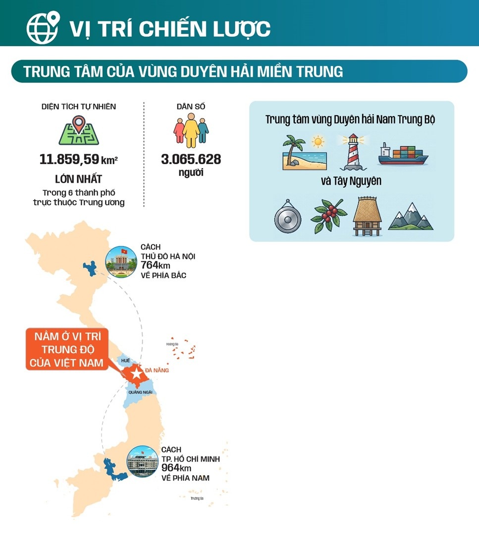 - Nằm ở vị trí trung độ của của Việt Nam (cách Thủ đô Hà Nội 764km về phía Bắc và cách thành phố Hồ Chí Minh 964km về phía Nam), diện tích tự nhiên 11.859,59 km², lớn nhất trong 6 thành phố trực thuộc Trung ương, và với dân số 3.065.628 người, Đà Nẵng đóng vai trò Trung tâm vùng Duyên hải Nam Trung Bộ và Tây Nguyên.